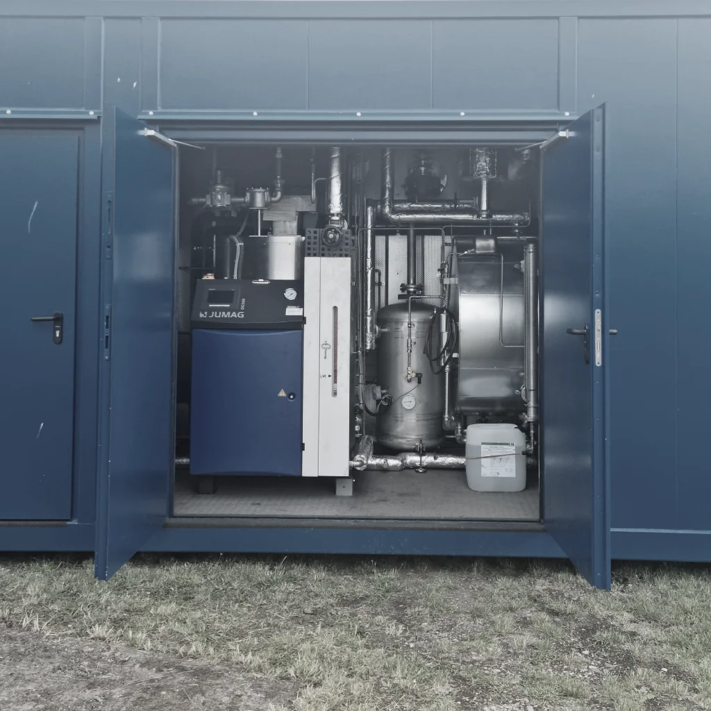 Entdecken Sie unseren einzigartigen Mietcontainer, der sofort einsatzbereit für Ihre Anforderungen zur Verfügung steht! Dieser hochmoderne Container ist nicht nur anschlussfertig, sondern verfügt auch über eine integrierte Wasseraufbereitung, einen Speisewasserbehälter mit Vollentgasung und einen Gaszähler – alles, was Sie für einen reibungslosen Betrieb brauchen.